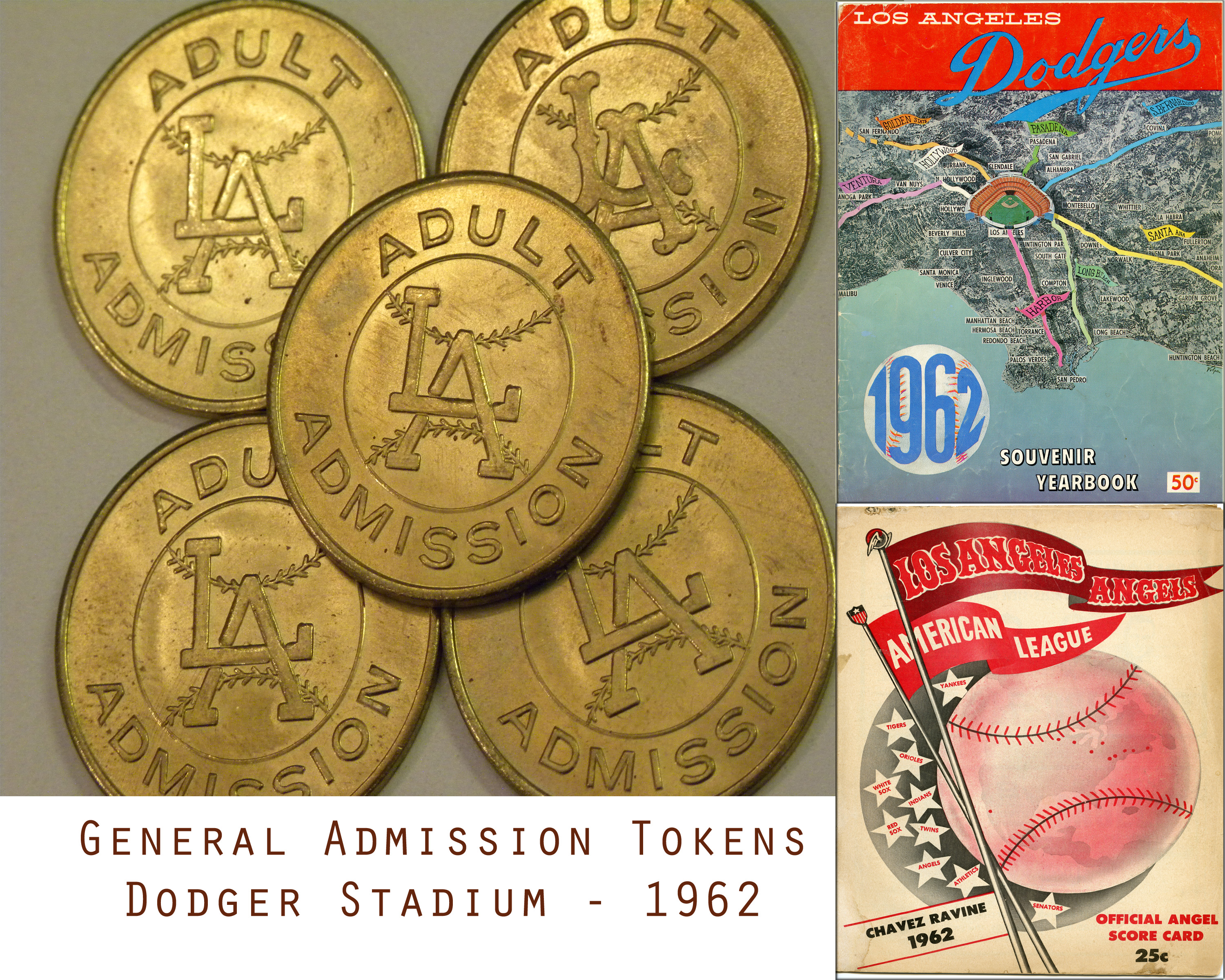 PHOTO: General admission coins from Dodger Stadium in 1962; the Dodgers Yearbook that season touted the roads to the new ballpark. The American League Angels played at “Chavez Ravine” from 1962-65.